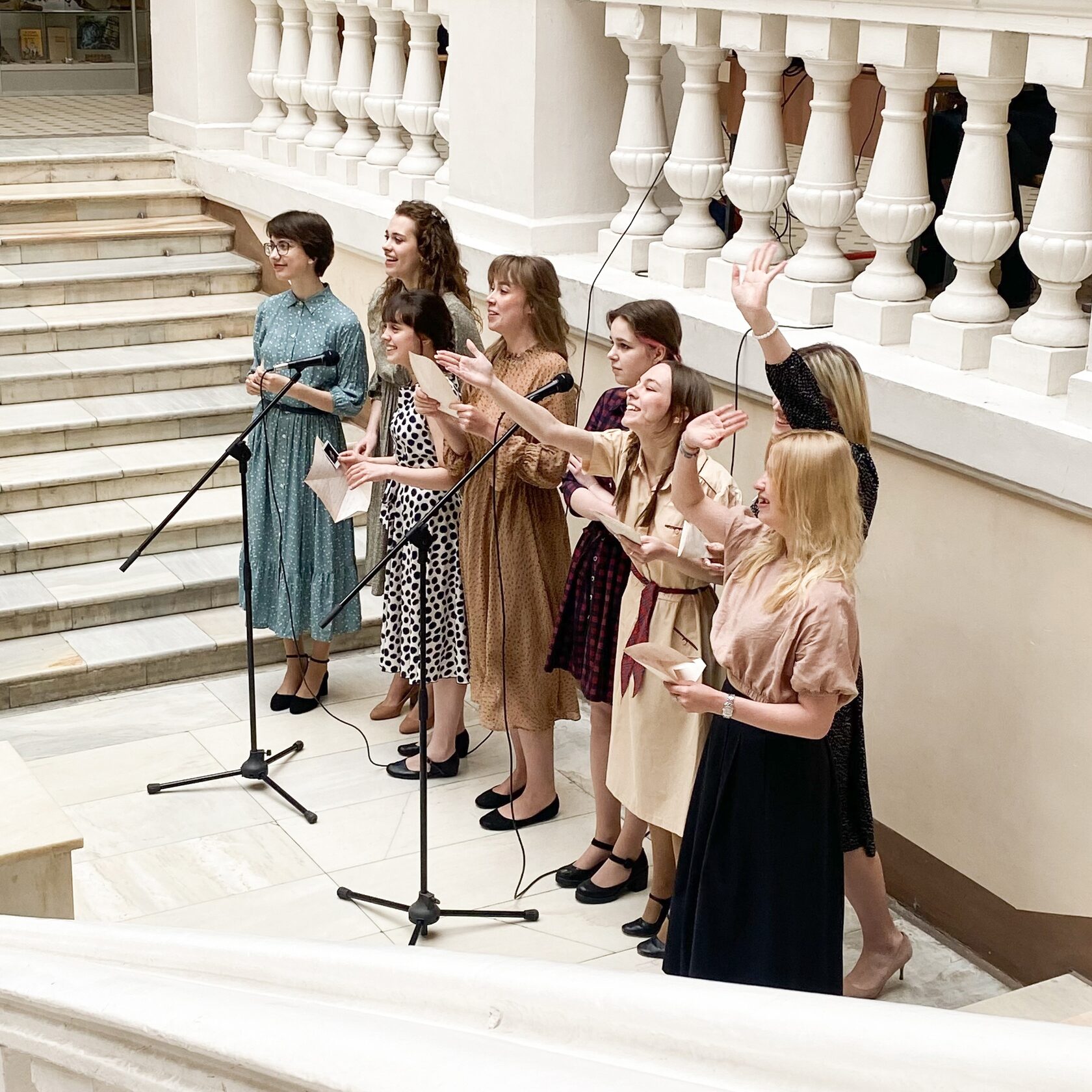 Студенческий театр Tabula Rasa представил на главной лестнице факультета журналистики МГУ постановку, посвящённую героям и жертвам Великой Отечественной войны. В трёх действиях актёры рассказали о важных вехах в жизни поколения, чьё взросление пришлось на военные годы.