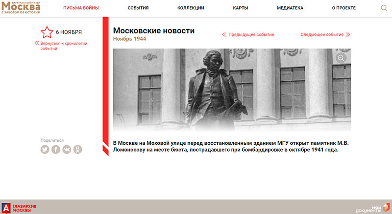 В коллекциях подлинных свидетельств того времени — на плакатах и картах, фотографиях и письмах особое место занимает Московский университет. Черно-белыми хранителями образов и примет эпохи стали фотографии, запечатлевшие Московский университет в «интерьерах» 1930-х и 1940-х годов. На сайте можно увидеть, как выглядел «старый университет» — здание МГУ на Моховой улице в августе 1938 года. Интересна предыстория фотомомента, «поймавшего» за чтением лекции студентам профессора биологического факультета МГУ С.С. Бурова. Сохранилась для вечности и торжественная церемония перед восстановленным зданием Московского университета на улице Моховой, на которой был открыт памятник М.В. Ломоносову взамен бюста основателю университета, пострадавшего при бомбардировке города в октябре 1941 года.